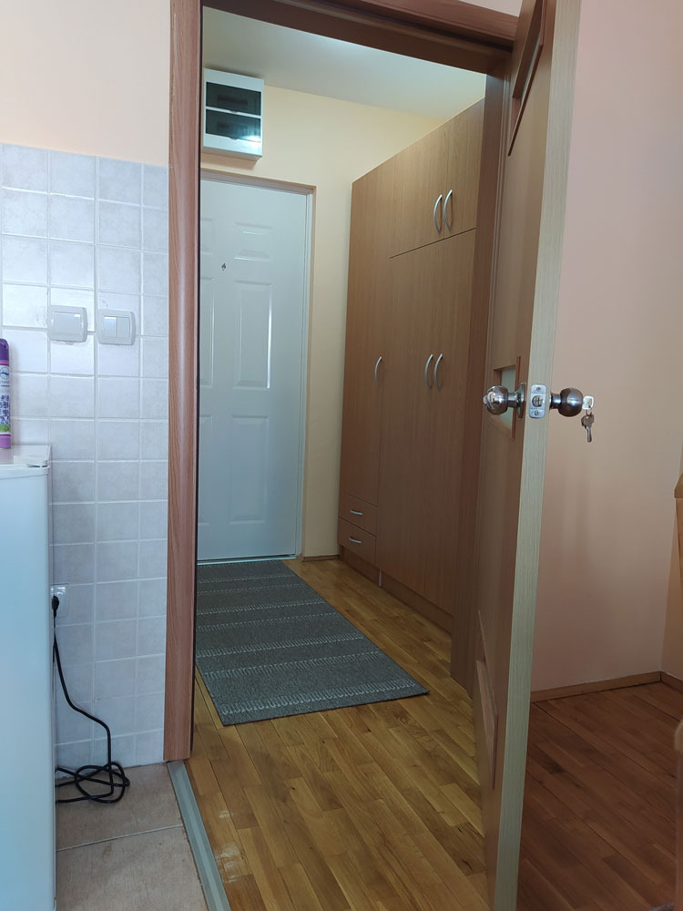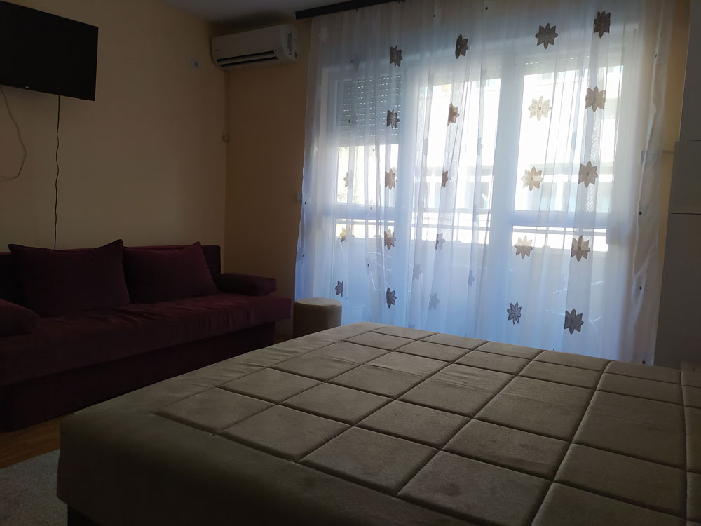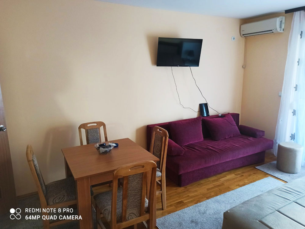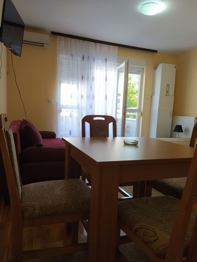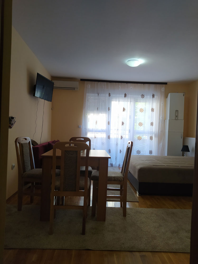 Apartman je tipa studio, namenjen za boravak 2+2 osobe. Ima kompletno opremljenu kuhinju, kupatilo sa tuš kabinom i terasu. Poseduje klimu, TV i WiFi. Obezbeđen parking prostor za goste apartmana.