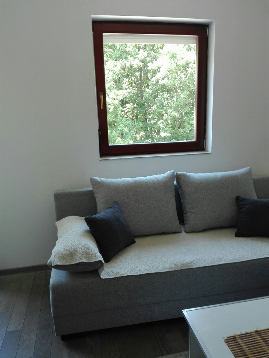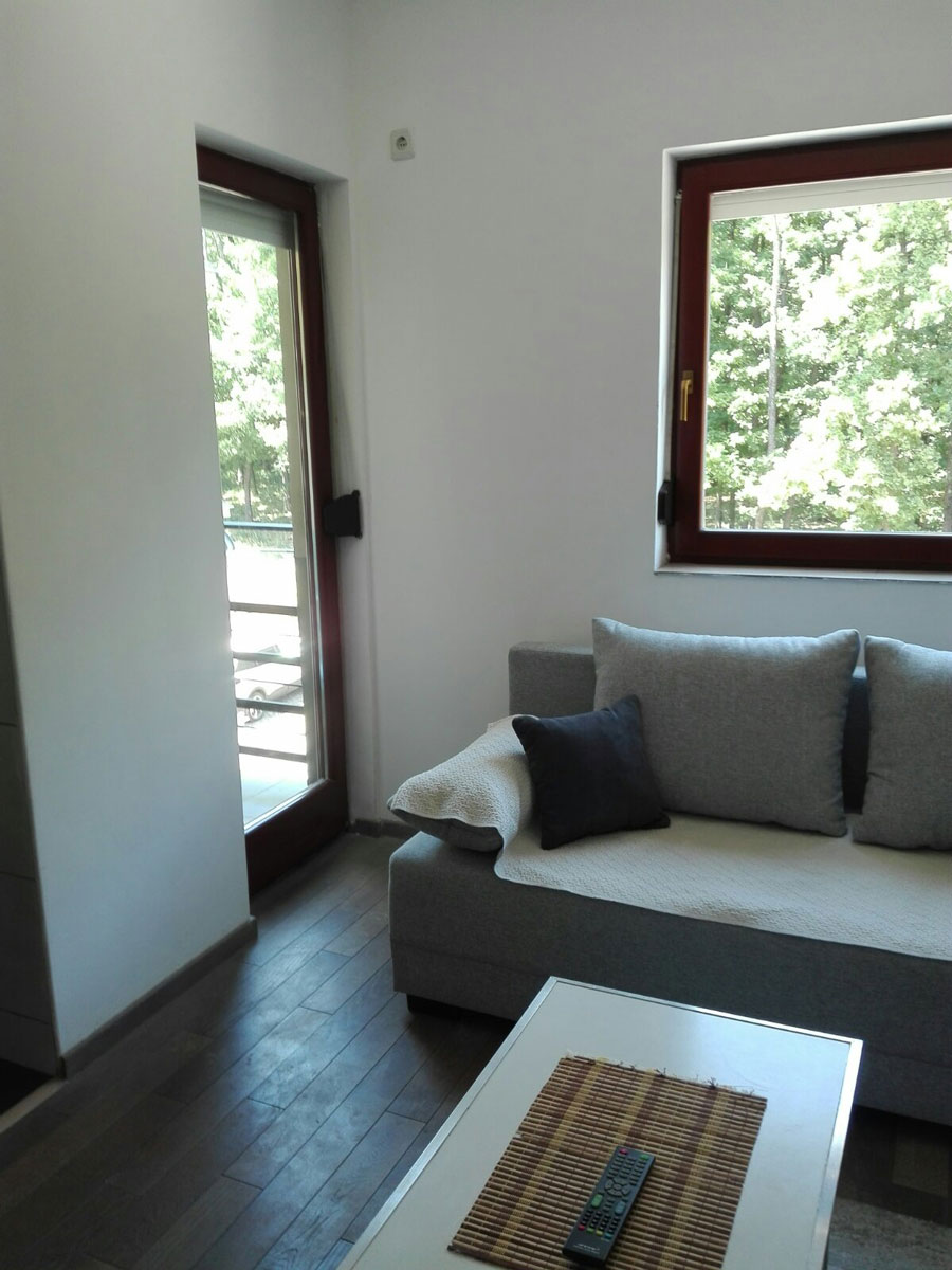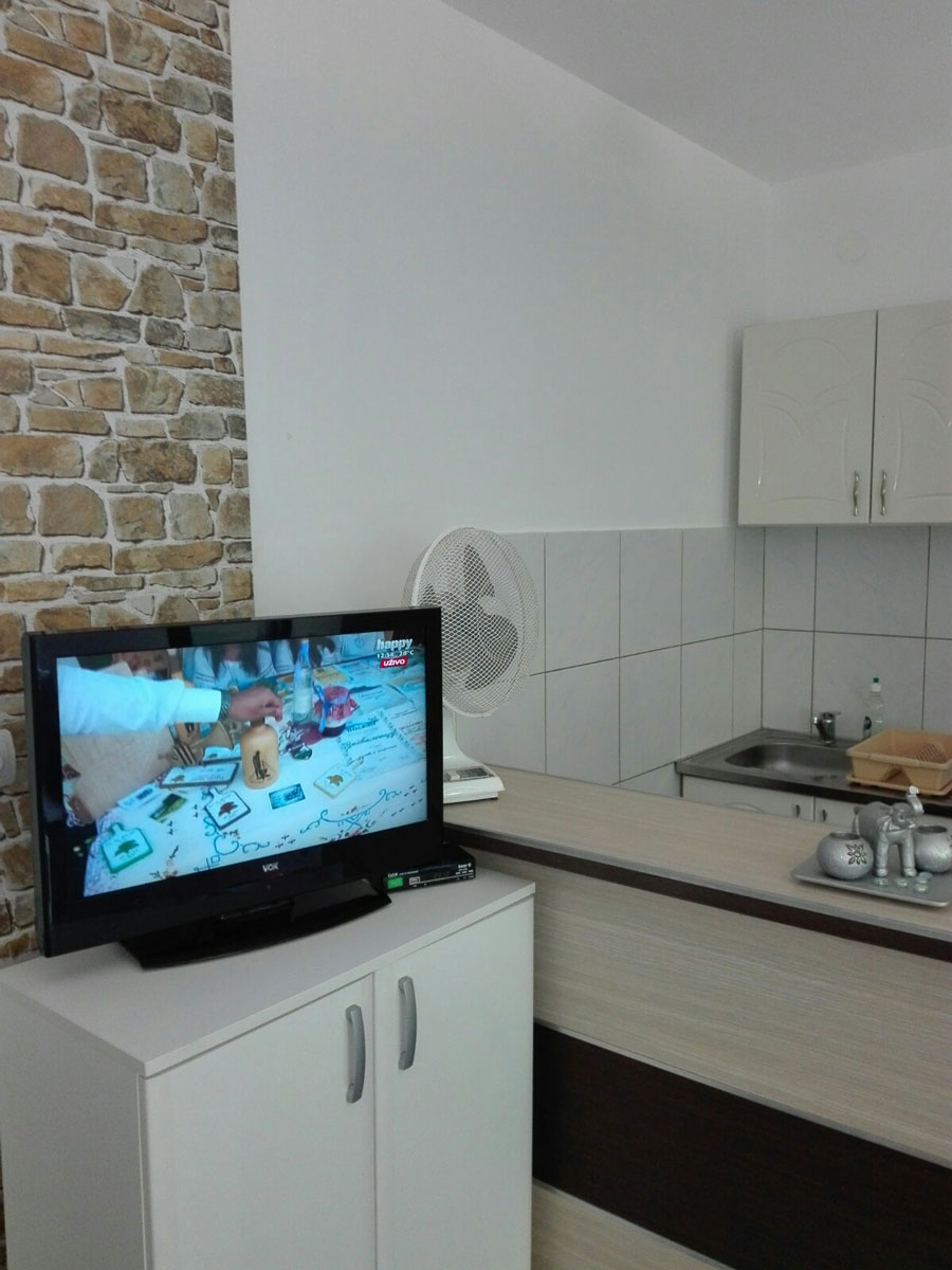 kompletnu kuhinju sa sudovima, dva ležaja koja se rasklapaju, oba su veličine francuskog, TV, neograničeni internet, kupatilo sa tuš kabinom u kome je i veš mašina i lepu terasu sa pogledom na zelenilo.