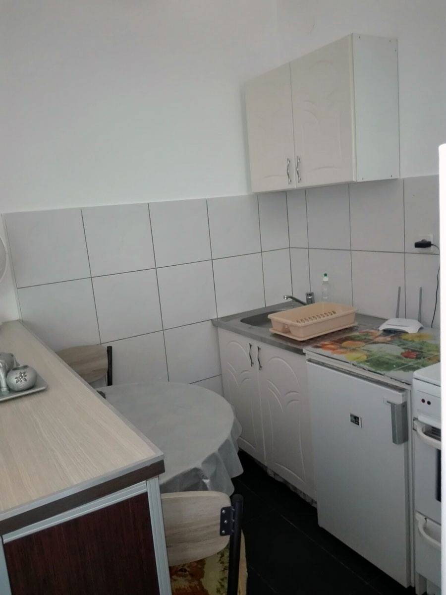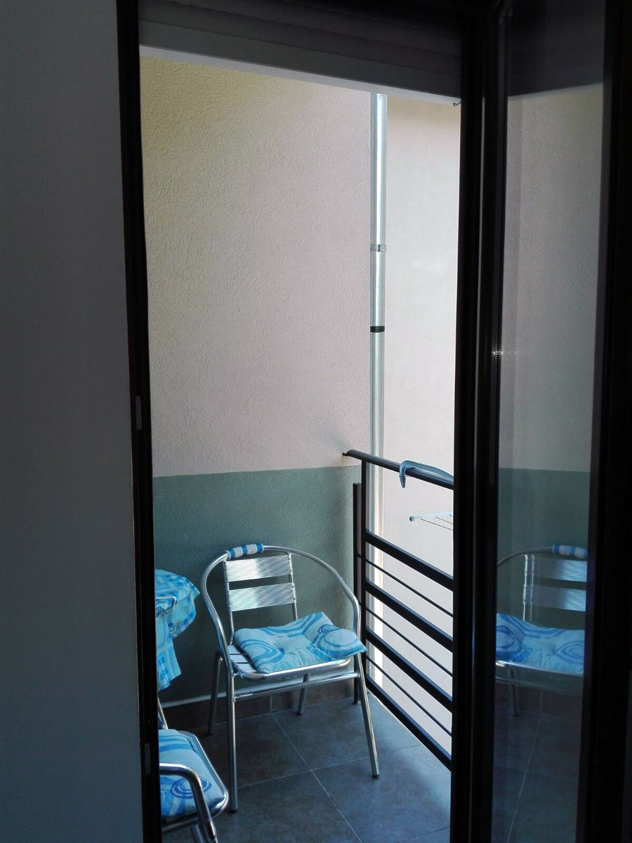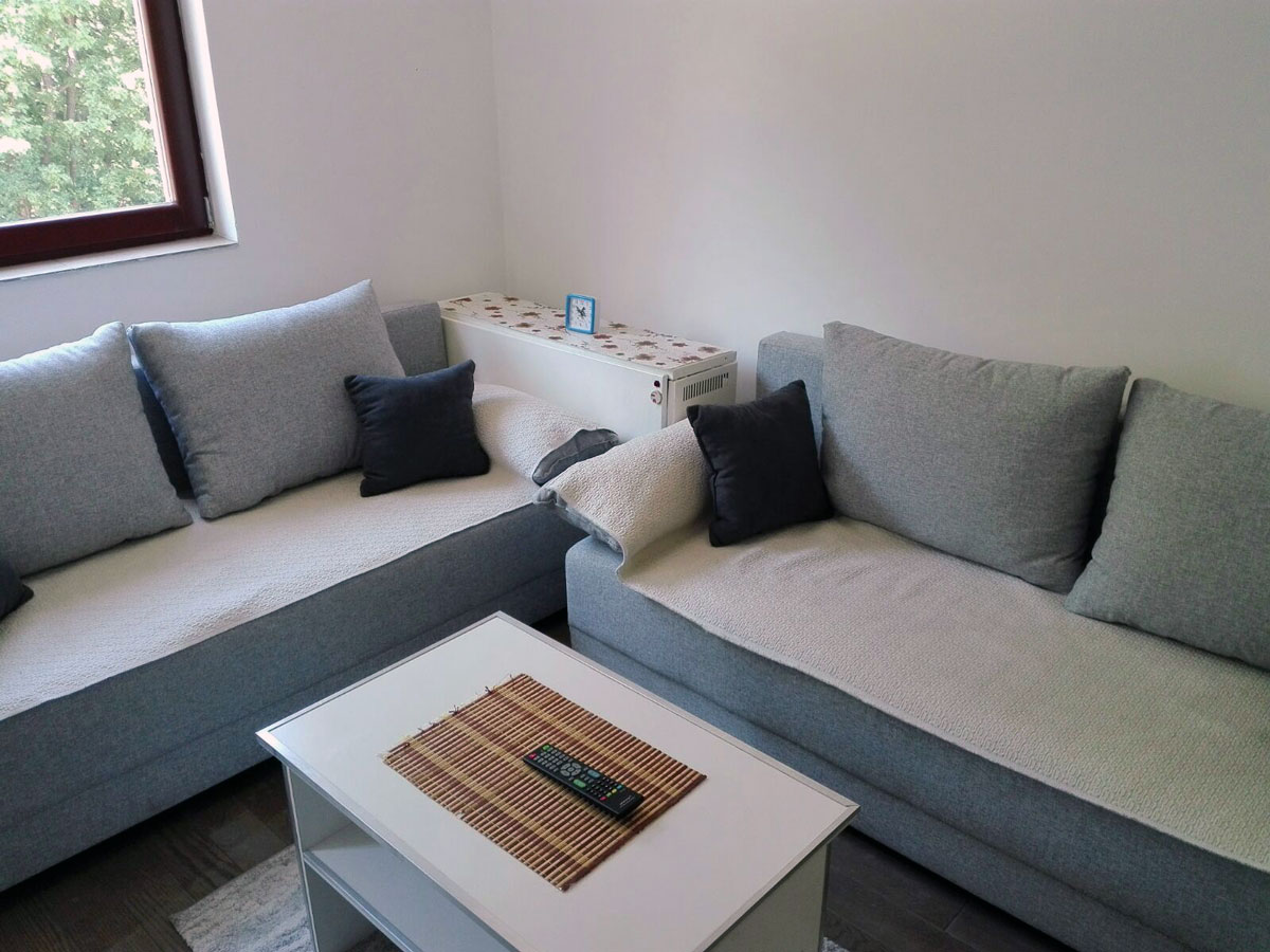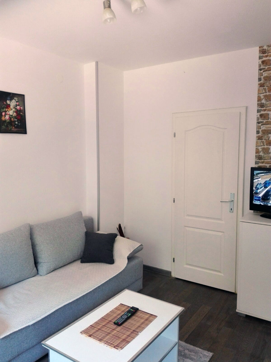 kompletnu kuhinju sa sudovima, dva ležaja koja se rasklapaju, oba su veličine francuskog, TV, neograničeni internet, kupatilo sa tuš kabinom u kome je i veš mašina i lepu terasu sa pogledom na zelenilo.
