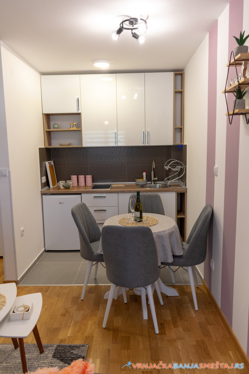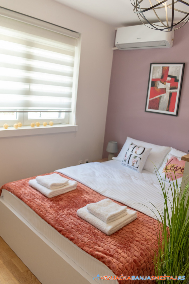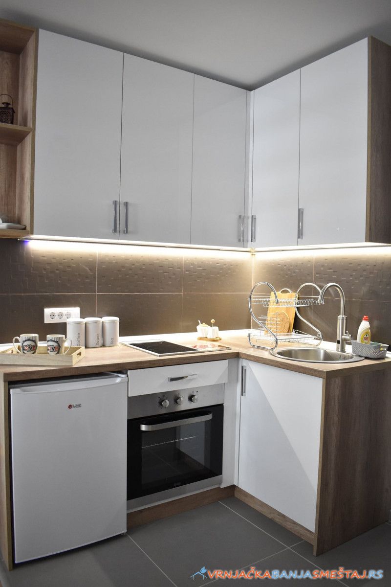 bračni krevet, opremljenu kuhinju, ugaonu garnituru na razvlačenje, sa prostirkom od memorijske pene, posteljinu, peškire, krevetac za bebe.