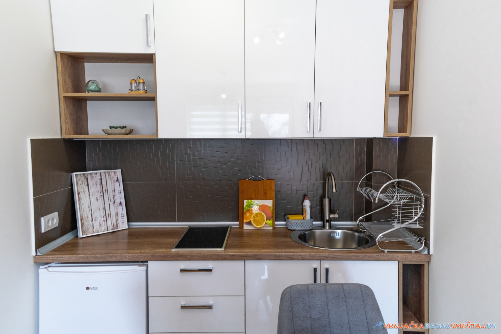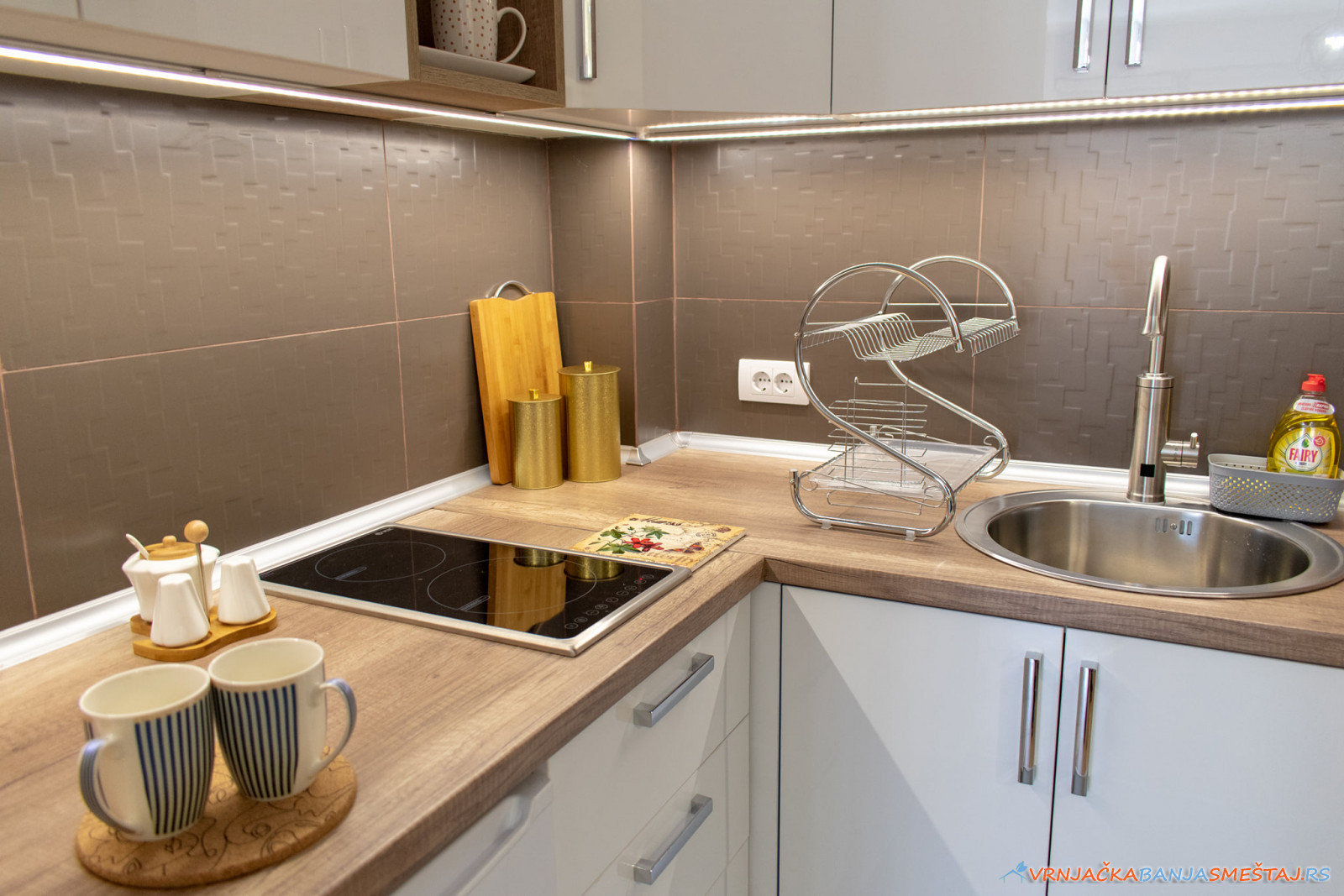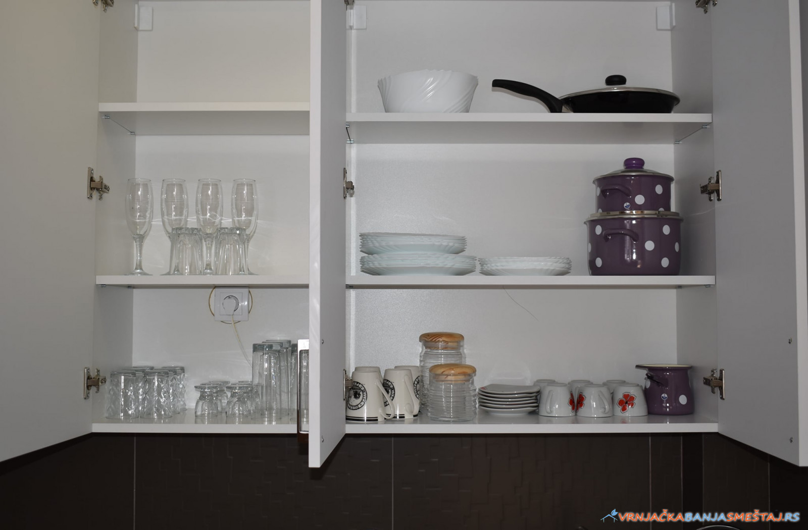 bračni krevet, opremljenu kuhinju, ugaonu garnituru na razvlačenje, sa prostirkom od memorijske pene, posteljinu, peškire, krevetac za bebe.