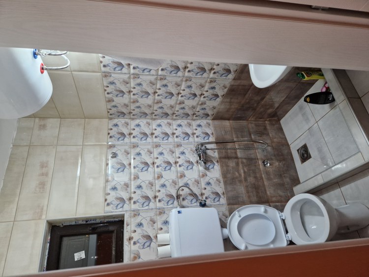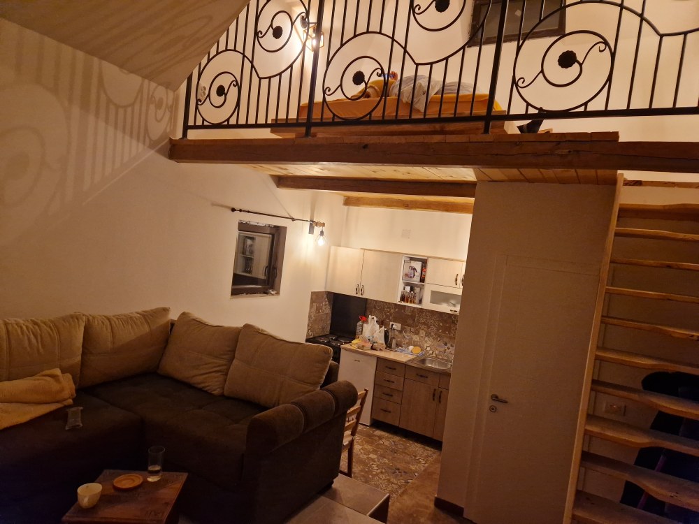 dnevnom sobom sa tv-om, izlazom na terasu sa prelepim pogledom , kuhinjom i trpezarijom, kupatilom i drvenom galerijom sa francuskim ležajem
